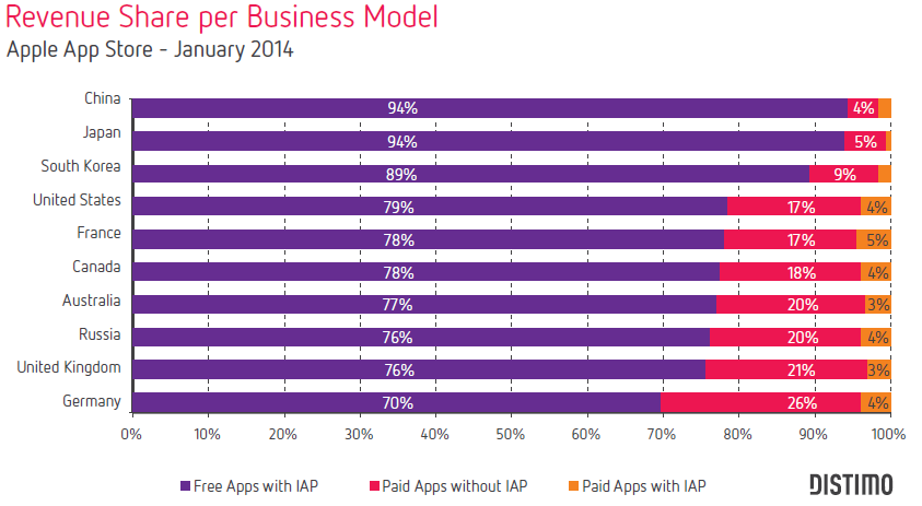 According to Distmo's 2014 February publicaton - How the Most Successful Apps Monetize Globally, you can see 94% of IOS app in China are Free app with in-app purchase and only 4% are paid with without in-app purchase.